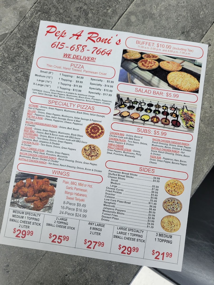 Pep A Roni’s offers a diverse and satisfying menu with something for every taste. Their pizza bowls are a standout, with options like the Meat Pizza Bowl, Bacon Chicken Ranch Pizza Bowl, and Chicken BBQ Pizza Bowl, catering to a variety of cravings. For those looking for subs, the Buffalo Chicken Ranch Sub and Pizza Sub are popular choices, alongside the customizable Build Your Own Sub. Gluten-free options are also available, including Cheese Pizza, Meat Pizza, and the flavorful Philly Cheese Steak Pizza. Their 16” X-Large pizzas, such as the Buffalo Chicken Ranch Pizza and Bacon Cheeseburger Pizza, offer hearty servings for bigger appetites. If you prefer a smaller size, the 8” Personal pizzas like the Bacon Chicken Ranch Pizza and Chicken Alfredo Pizza are perfect for a solo meal. On the side, you can enjoy items like Garlic Bread and French Fries, as well as appetizers like Cheese Curds and Mozzarella Sticks. For dessert, treat yourself to Apple or Chocolate Chip Cookies or indulge in Cinnamon Breadsticks. To wash it all down, choose from a variety of sodas, including Mountain Dew and Diet Pepsi. With its wide range of pizzas, subs, wings, and more, Pep A Roni’s menu is sure to satisfy any craving.